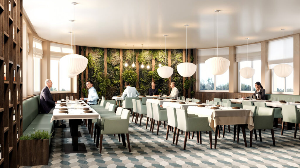 Visualisierungen der normgerechten Einrichtung mit Wegeführung, Bedienhöhen und projektspezifische Möblierung.