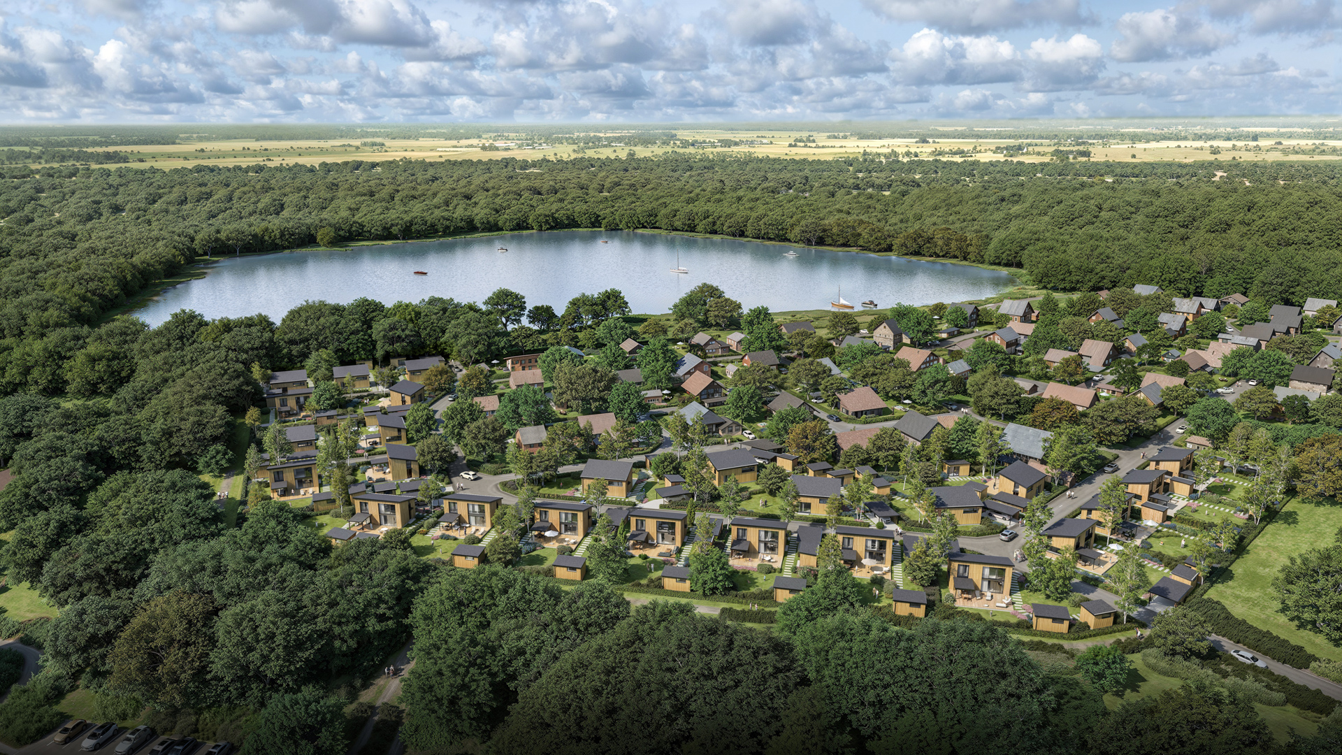 Mit dem Architekturkonzept Ferienhausgebiet Holsterfeld entsteht ein klares Bild des Projekts: Haus- und Saunatypen sind definiert, Grünflächen, Terrassen, Carports und Zuwegungen sind geplant und im Arealzusammenhang mit Bezug auf den Hengemühlensee dargestellt.