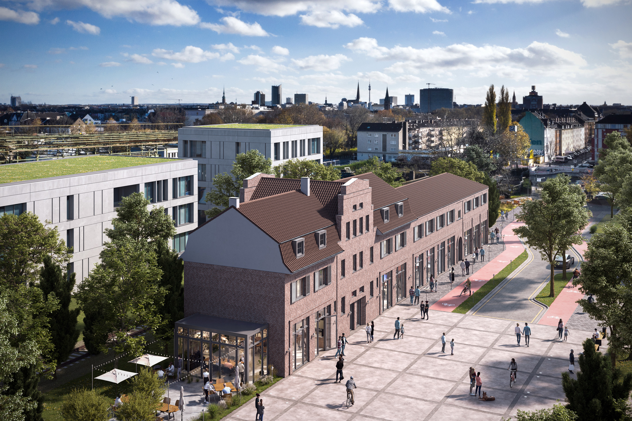 Wir rekonstruieren den Speicher als denkmalgeschütztes Gebäude in Dortmund, arbeiten Außenflächen und Erschließung aus und visualisieren neue Nutzungen mit Gewerbe, Gastronomie und Büro-Interieur.
