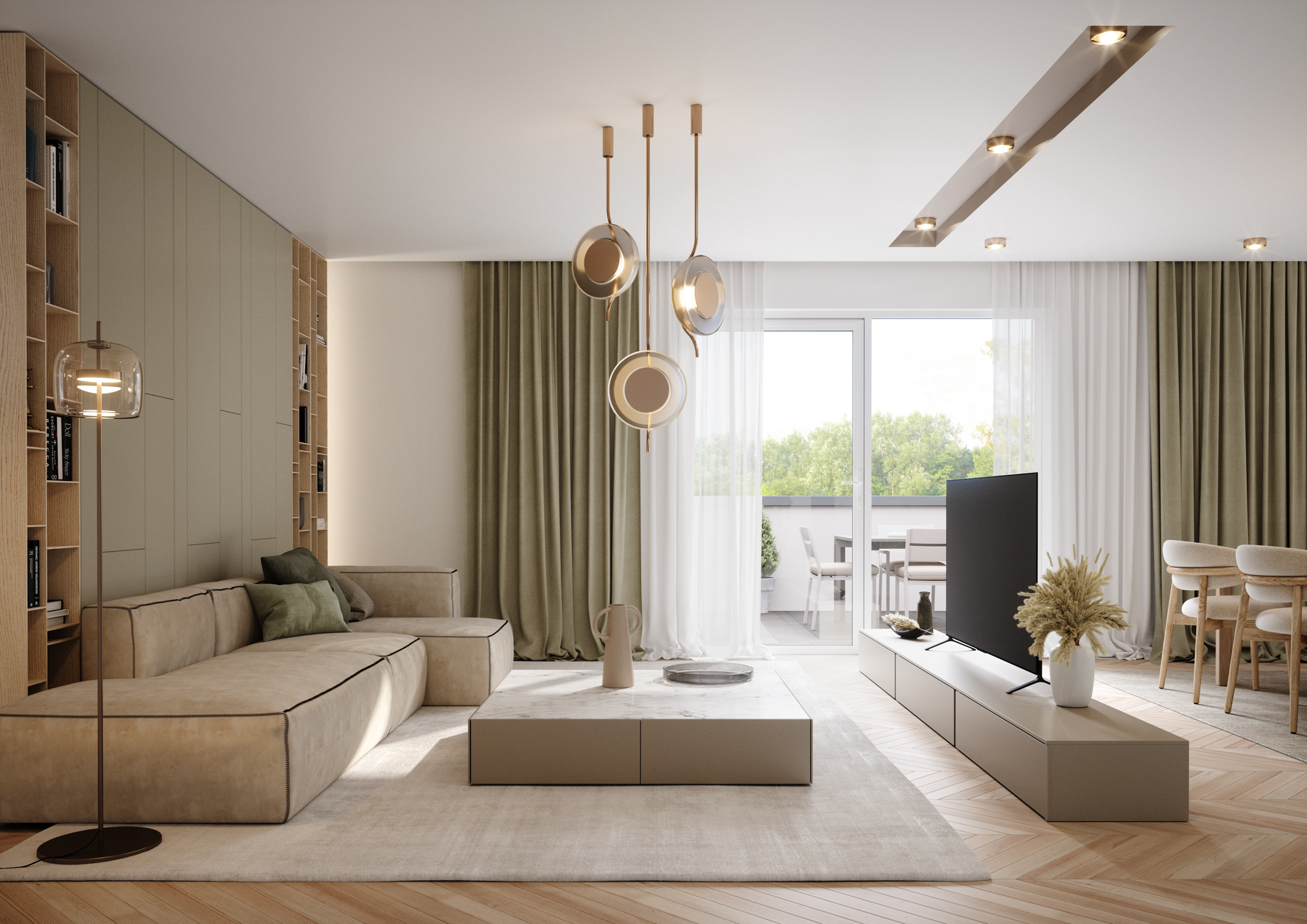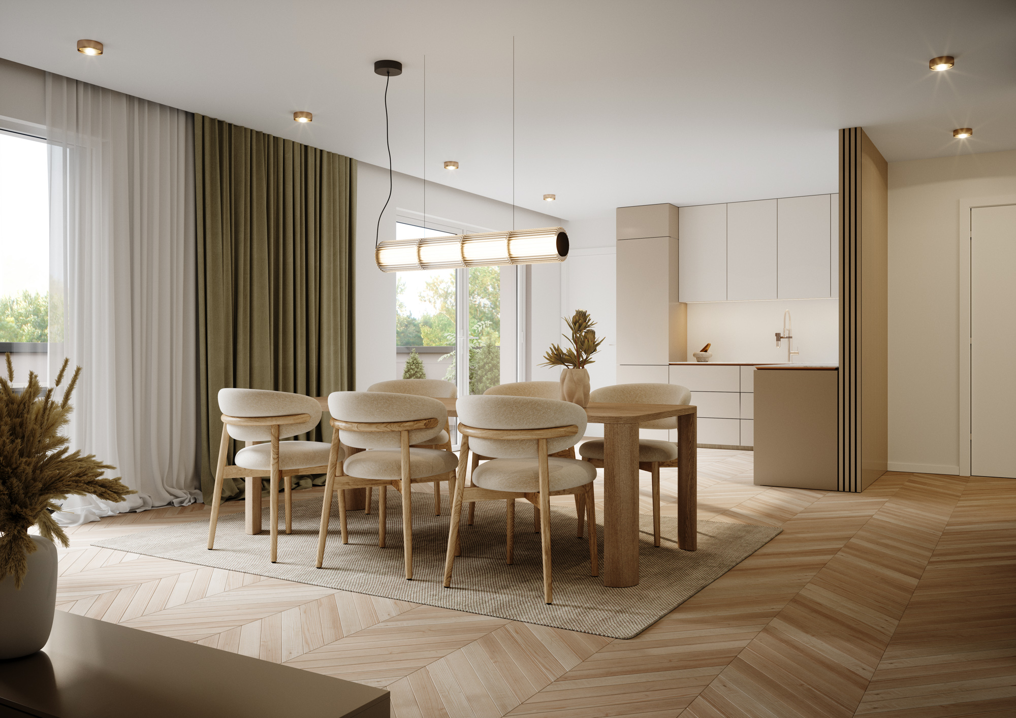 Die Penthouse‑Wohnungen sind Teil des Wohnquartiers Heepen in Bielefeld. Die Architekturkonzeption des Quartiers stammt von Formgrafik. In diesem Projekt gestalten wir das Interieur – Möblierung, Materialien und Beleuchtung – und setzen es in realistische 3D‑Visualisierungen um.