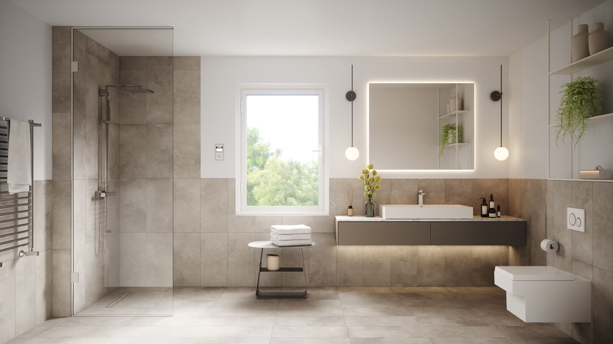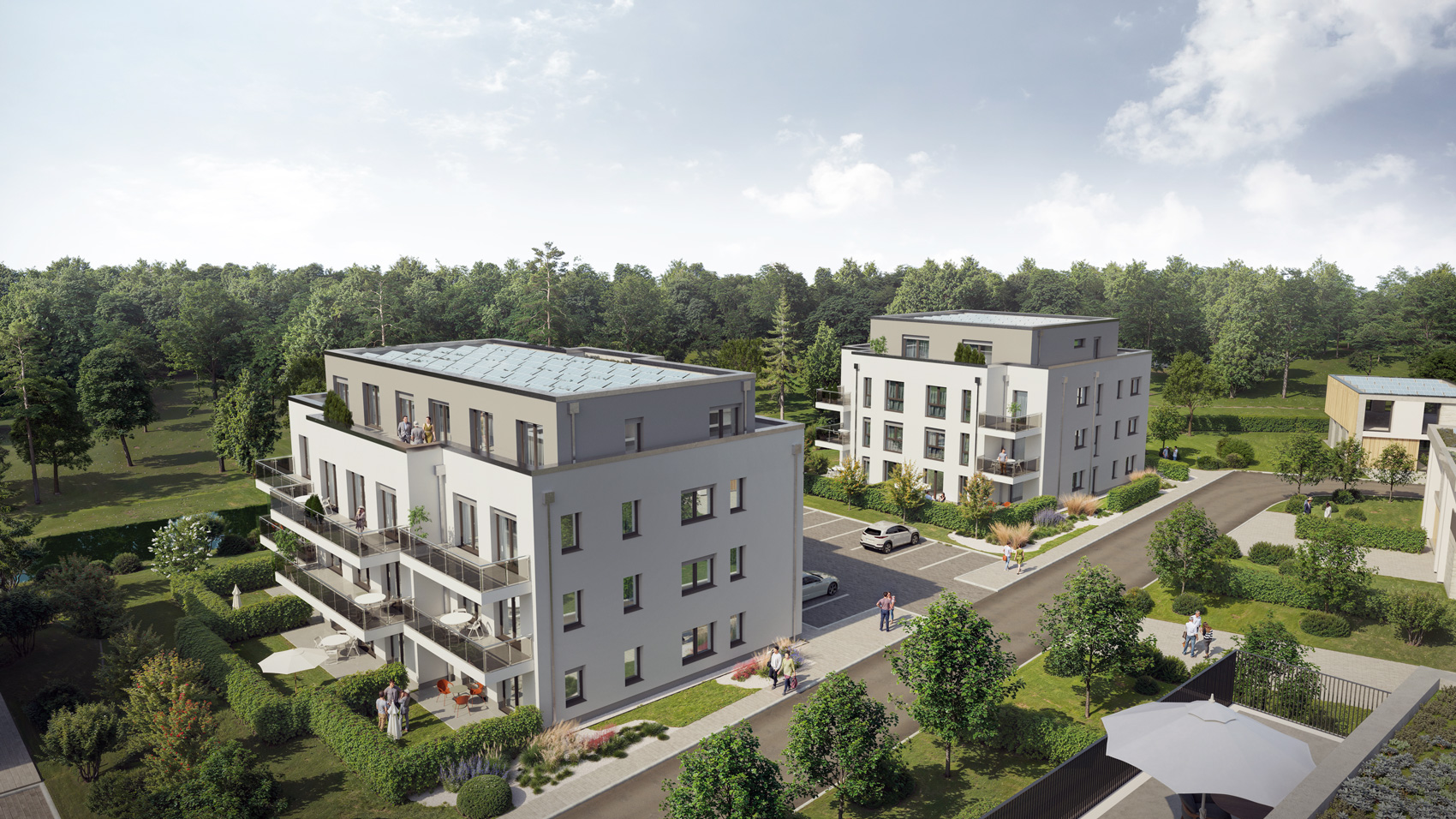 Die Schlüsselansichten zeigen Wohnküche, Bad und Stauraumlösungen. Außerdem erstellen wir Außenansichten des Mehrfamilienhauses. Der Motivsatz ist für Exposé und Web aufbereitet und sorgt für eine durchgängige Architektursprache im Quartier.