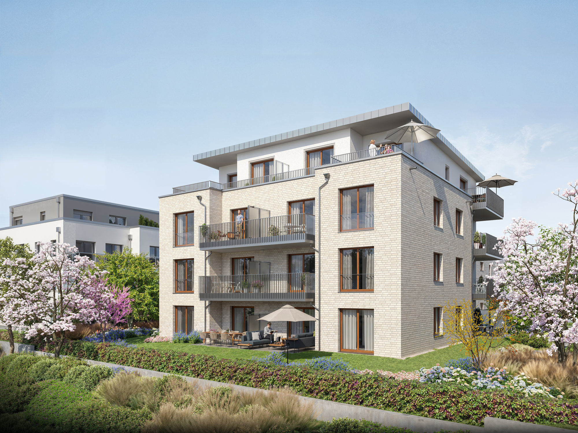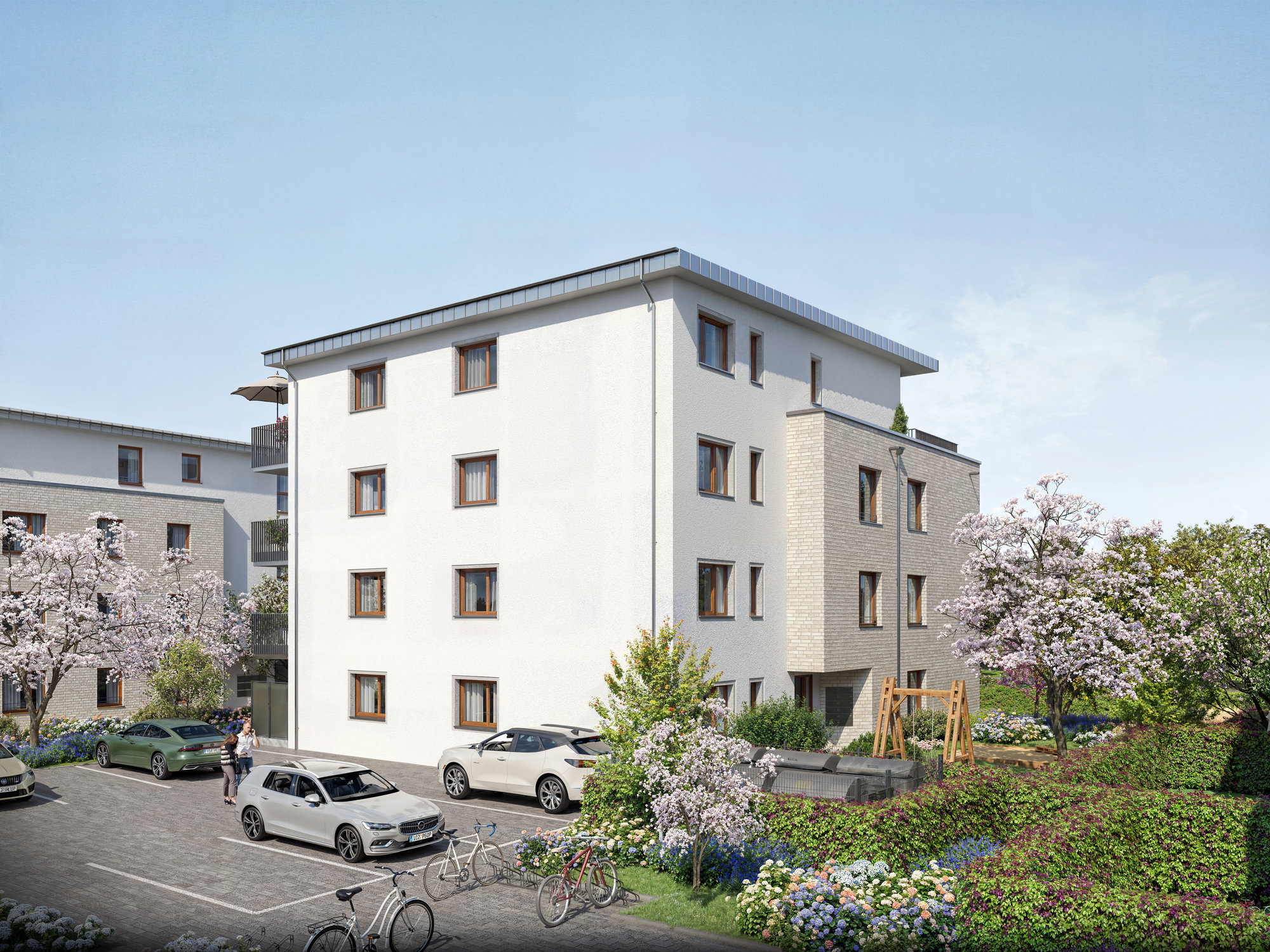 Die Visualisierungen zeigen Gebäudewirkung, Außenraum und Erschließung in wenigen klaren Motiven und ordnen das Mehrfamilienhaus als Teilprojekt des Wohnquartiers ein. Die Interieurvisualisierungen ergänzen das Bild um die Wohnqualität der Erdgeschosswohnung und unterstützen Exposé, Online-Vermarktung und Beratungsgespräche.