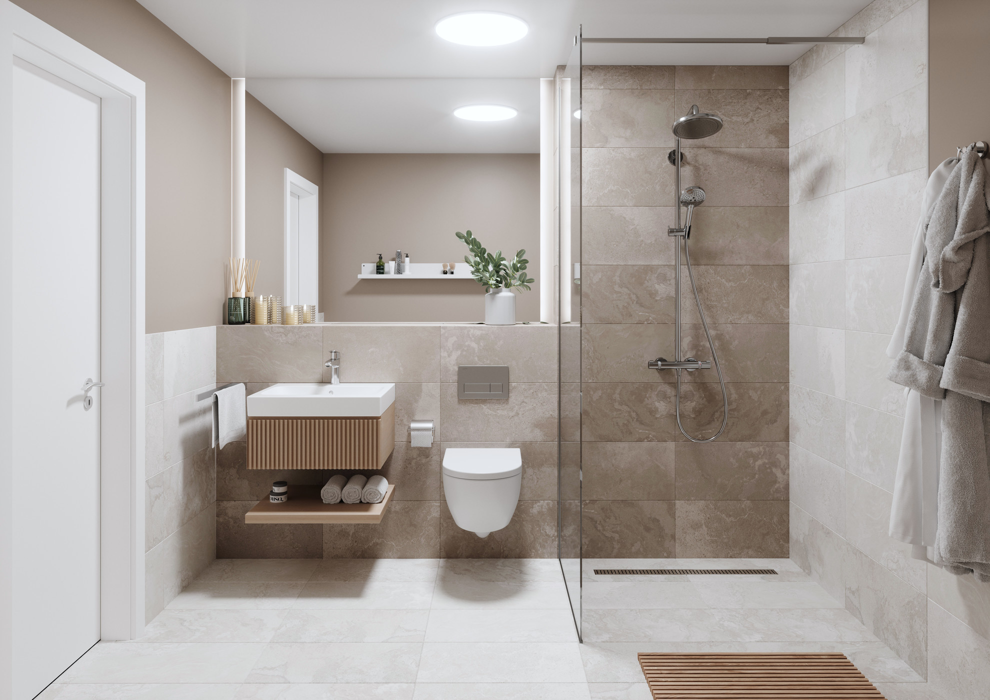 Ergänzend visualisieren wir das Interieur einer Erdgeschosswohnung. Wohn-/Essbereich mit offener Küche sowie das Bad werden in abgestimmter Materialität und klarem Maßstab dargestellt, damit Grundriss, Terrasse und Wohnqualität schnell erfassbar sind.