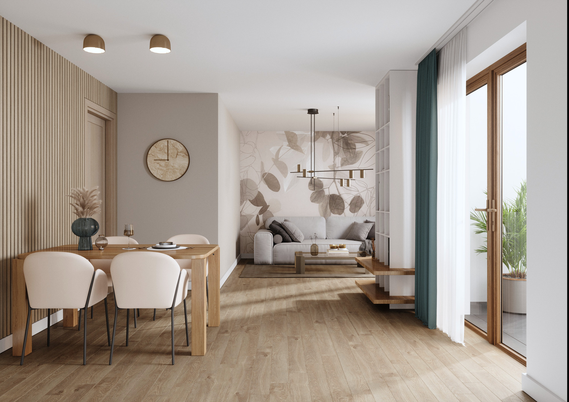 Für die Interieurvisualisierungen legen die Innenarchitektur fest, planen die Beleuchtung und wählen Perspektiven, die Wohn-/Essbereich mit offener Küche sowie das Bad präzise zeigen.