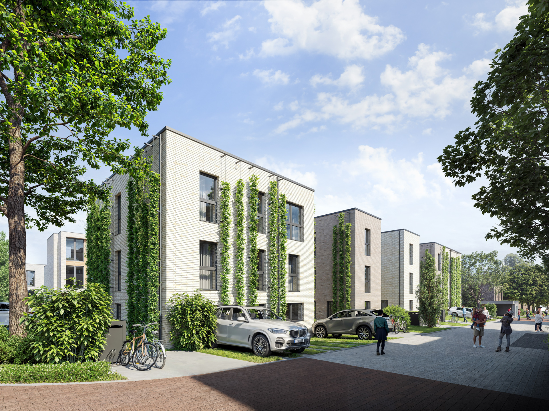 Wir zeigen ein Reihenhausprojekt nahe der Emsaue mit klar ausgearbeiteten Außenansichten, Umfeld und Erschließung.