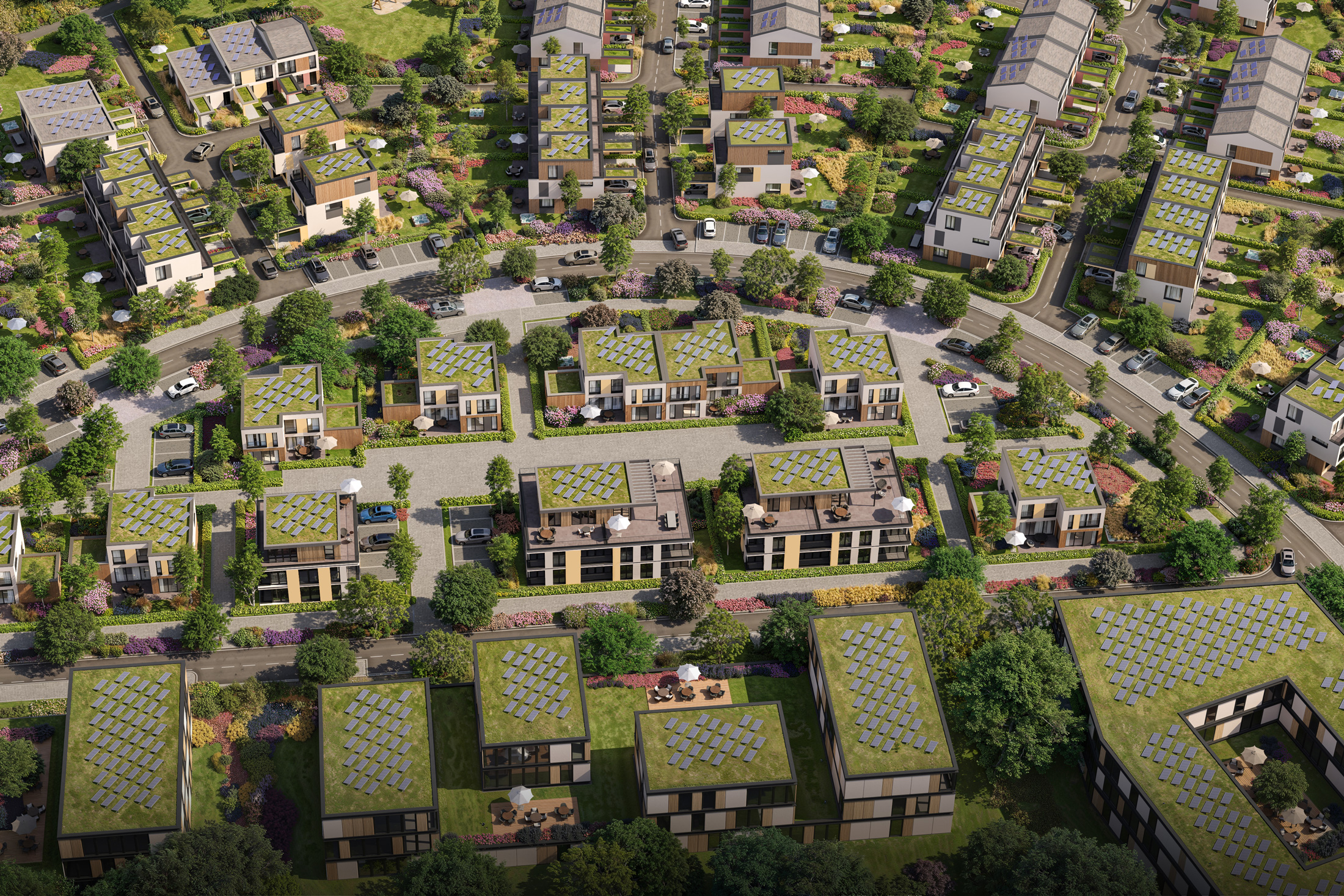 Konzept für Bebauung, Freiräume und Erschließung. Wir definieren Gebäudetypen, entwickeln eine schlüssige Architektursprache und visualisieren das Quartier.